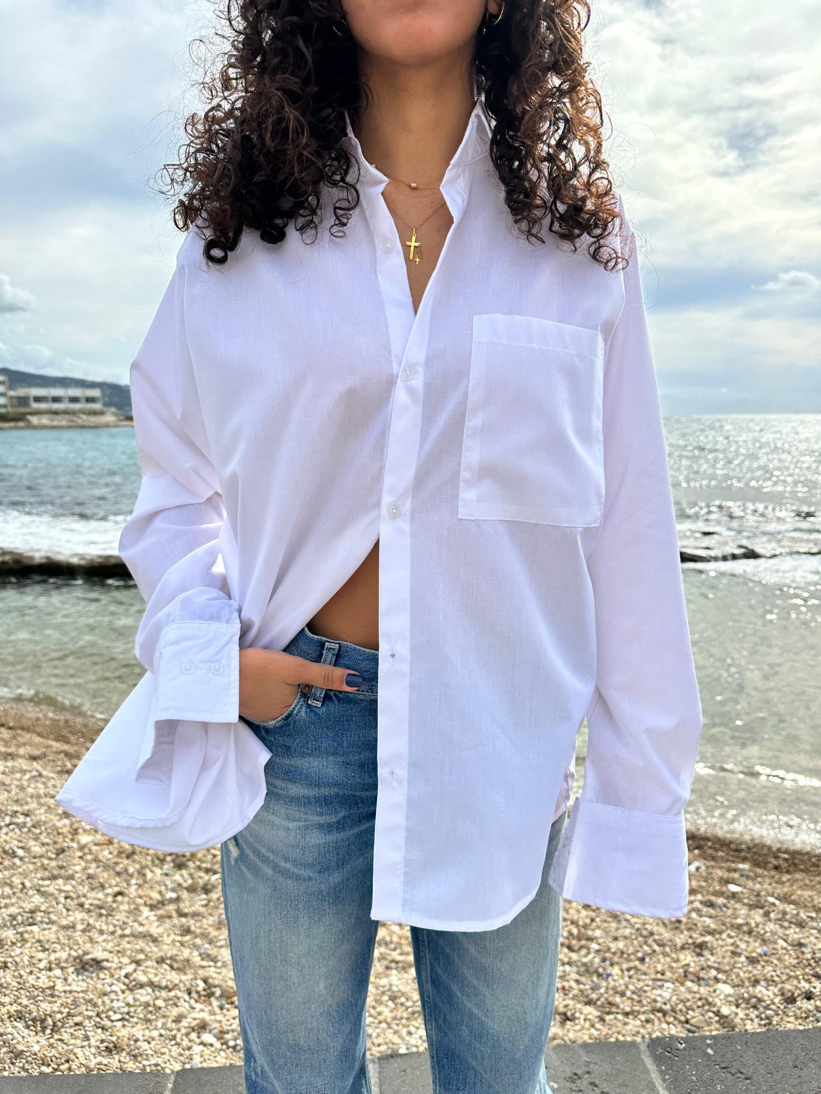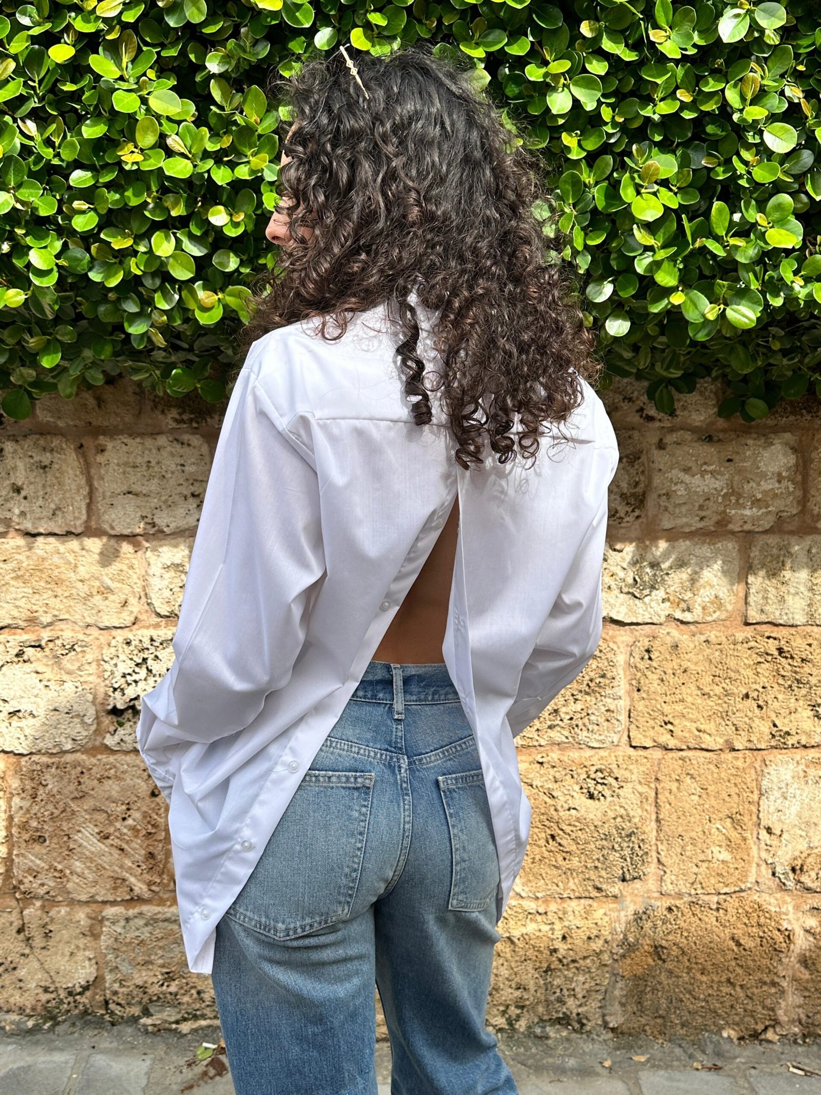 This oversized white shirt exudes timeless elegance and sophistication. Its flowing silhouette gracefull drapes the body, while the open back detail adds a hint of allure and intrigue.