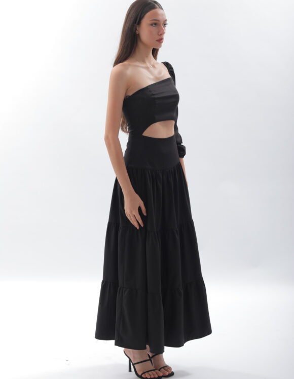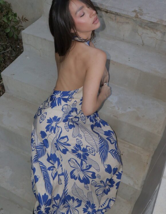 A long flowy dress with a open back. Made from soft breathable fabric , the dress drapes effortlessly, offering both comfort and elegance with a minimalist design.